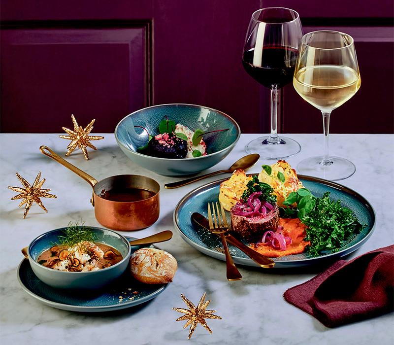 Oksemørbrad med gulerodspuré, cremet kartoffel gratin og ristet grønkål. Anrettes med syltede rødløg, friske ærteskud og rødvinsglace.